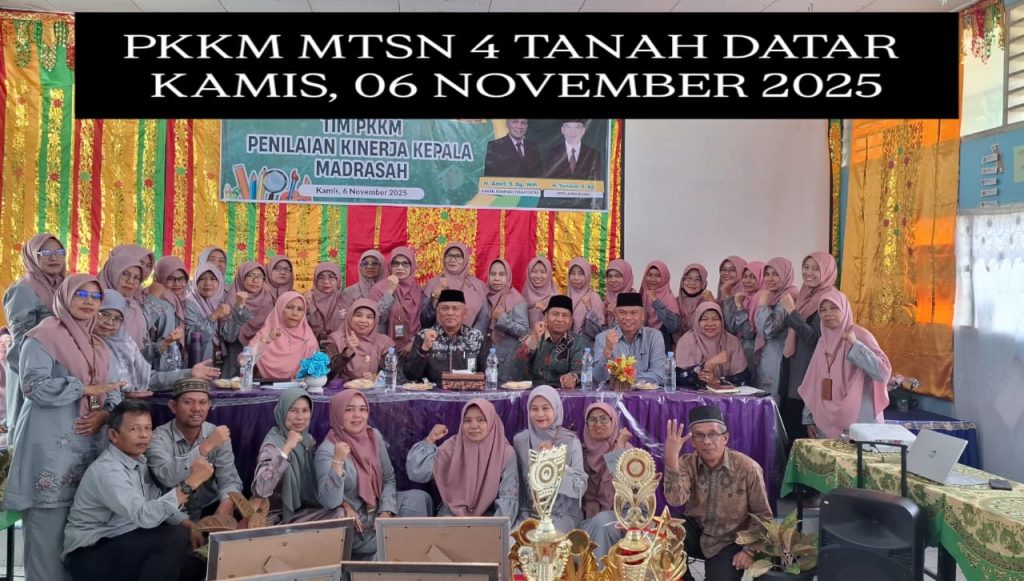 Kegiatan Penilaian Kinerja Kepala Madrasah (PKKM) MTsN 4 Tanah Datar Tahun 2025 berlangsung dengan tertib dan penuh suasana profesional. Acara ini secara resmi dibuka oleh Kepala Kantor Kementerian Agama Kabupaten Tanah Datar, H. Amril, M.M., yang dalam sambutannya menegaskan pentingnya evaluasi kinerja sebagai upaya meningkatkan mutu pelayanan pendidikan serta memperkuat tata kelola madrasah yang efektif, berintegritas, dan berorientasi pada kualitas.